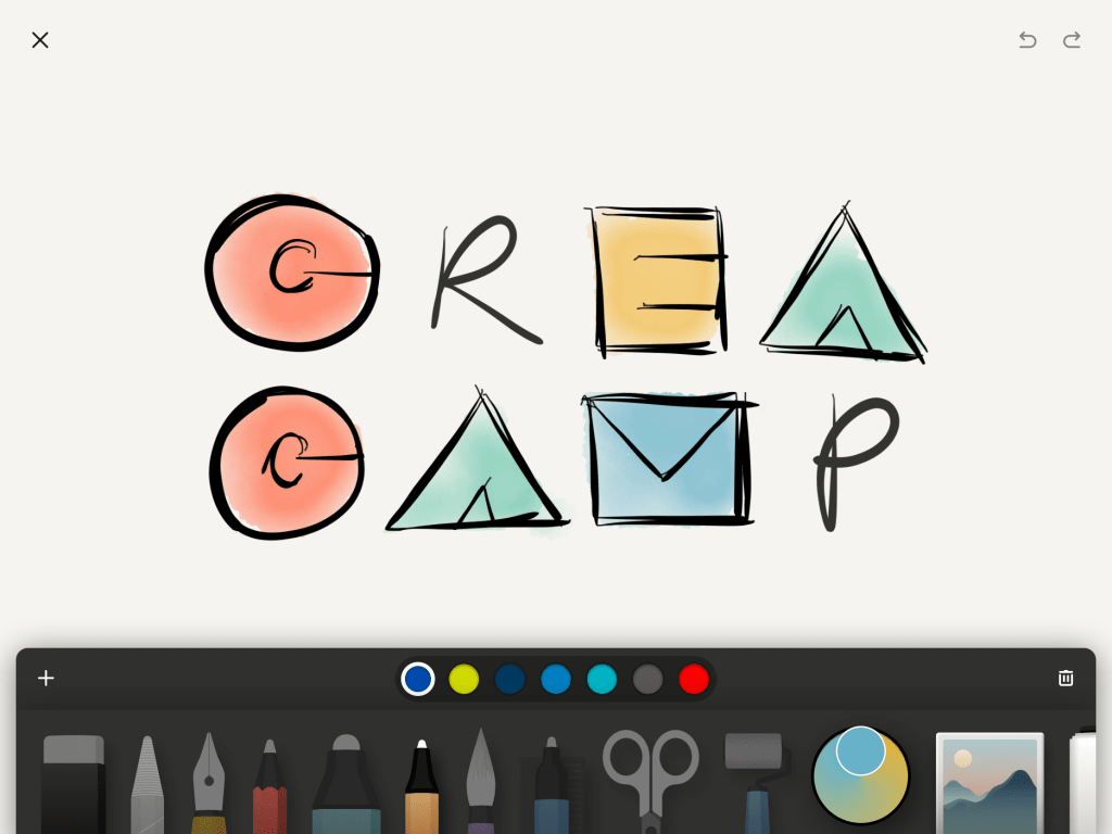 L’idée est demeurée vivante et l’automne suivant, on se lançait lentement mais sûrement dans la planification d’un premier événement pour le printemps suivant. De concert avec mes collègues Sarah Shallow-Tardif et Pierre-Olivier Cloutier, nous avons déterminé quelques thèmes phares à aborder. Alors que nous nous occupions de la logistique de l’école hôte, Audrey faisait aller ses contacts pour dénicher les meilleurs facilitateurs pour accompagner les participants. L’École branchée allait s’occuper de faire connaître l’événement et récolter les inscriptions. À la demande d’Audrey, j’ai griffonné une signature visuelle CréaCamp sur ma tablette pour contribuer à donner une identité au concept (notez que c’est cette « œuvre beta” qui est restée depuis!).